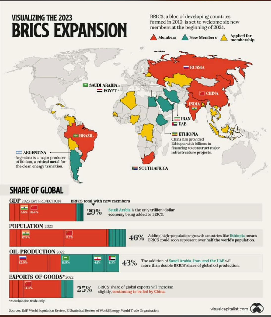 5. New kids on the block are willing to do what it takes to spread their influence…i.e., Russia and China with the tacit support of the Gulf Nations. (https://www.cbsnews.com/news/china-russia-brics-iran-saudi-arabia-egypt-among-nations-join-economic-bloc/#:~:text=The%20United%20Arab%20Emirates%2C%20Argentina,Global%20South%20in%20world%20affairs.)